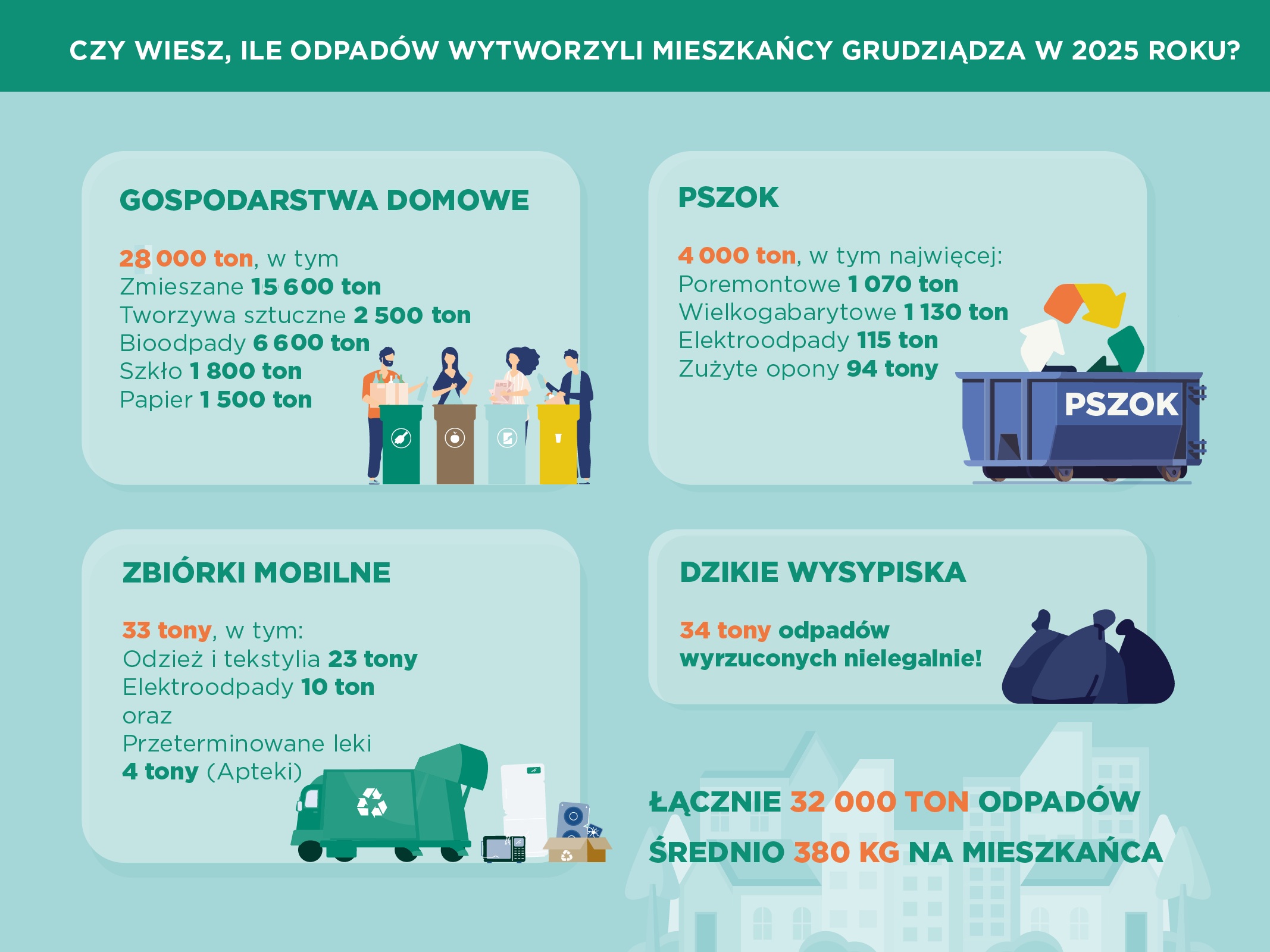 Łącznie odpady wytworzone przez mieszkańców Grudziądza w swoich gospodarstwach domowych wrzucone do pojemników, przekazane do PSZOK-ów, aptek oraz zebrane w ramach zbiórek mobilnych w 2025 roku to aż blisko 32 000 ton odpadów.